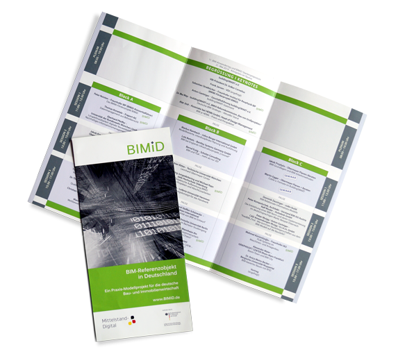Für BIMiD haben wir das Logo entwickelt und verschiedene Printmedien umgesetzt. Besonders spannend war die Arbeit mit den verschiedenen Beteiligten am BIM-Leitfaden, in dem die Erkenntnisse aus den Projekten zusammengeführt sind.